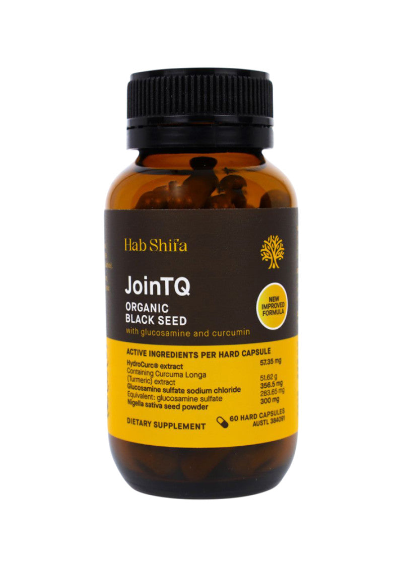 Hab Shifa JointQ is a unique formulation of Vegetarian Glucosamine (Glucosalive*), Curcumin (Curcuma longa) and Black Seed (Nigella sativa) and is designed to provide anti-inflammatory support and promote healthy joint function.
