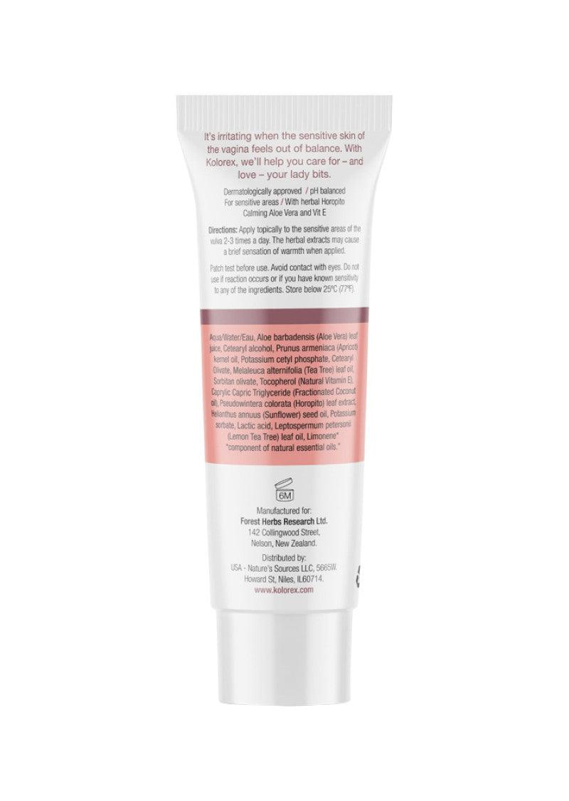 Kolorex® Vaginal Care Cream is pH balanced herbal cream, designed to calm and restore your skin, so that it looks and feels healthy again. With the combined powers of herbal Horopito, Aloe Vera, Tea Tree Oil and Vit E ‐ you'll find peace from life's little irritations.